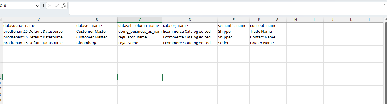 This will mainly be in CSV file format throughout the application. Note that example Mappings may be shown in the template; please delete them before using the template. As long as the names are spelt correctly and the user has Catalog Admin rights, the user can import the mappings from any of the four types of screens mentioned earlier.