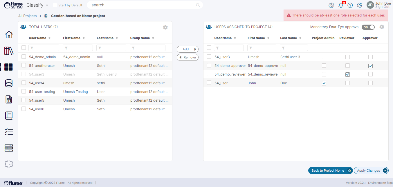 Manage Project Users: Click the icon and use this screen to quickly make changes to the existing users and their assigned roles in the Project.