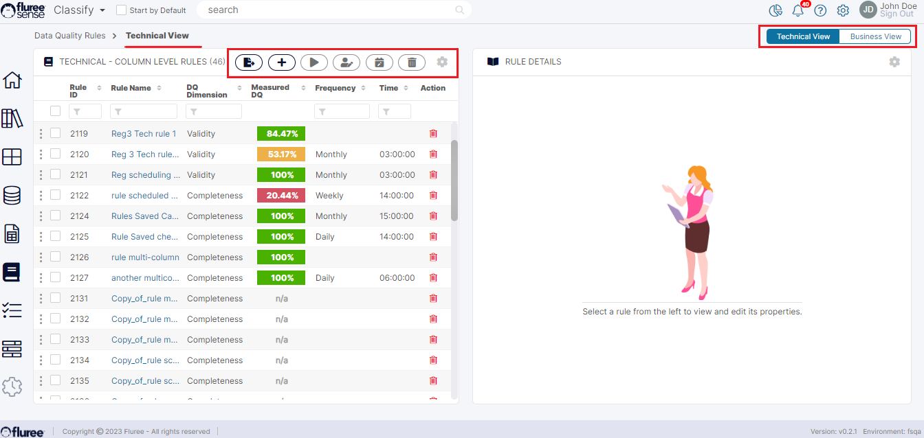 The system offers two screens or views. One of the two views lists all the Data Quality rules pertaining to the technical rule type. This view is called the Technical View. The other view lists all the data quality rules pertaining to the business rule type. This view is called the Business View.