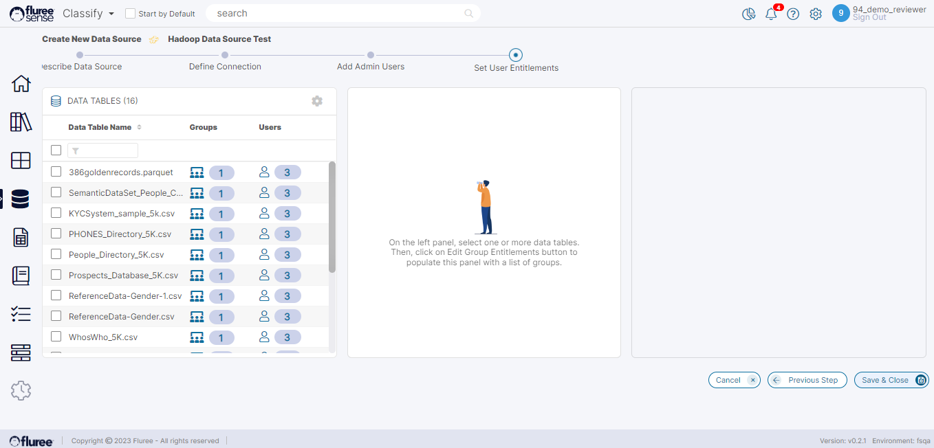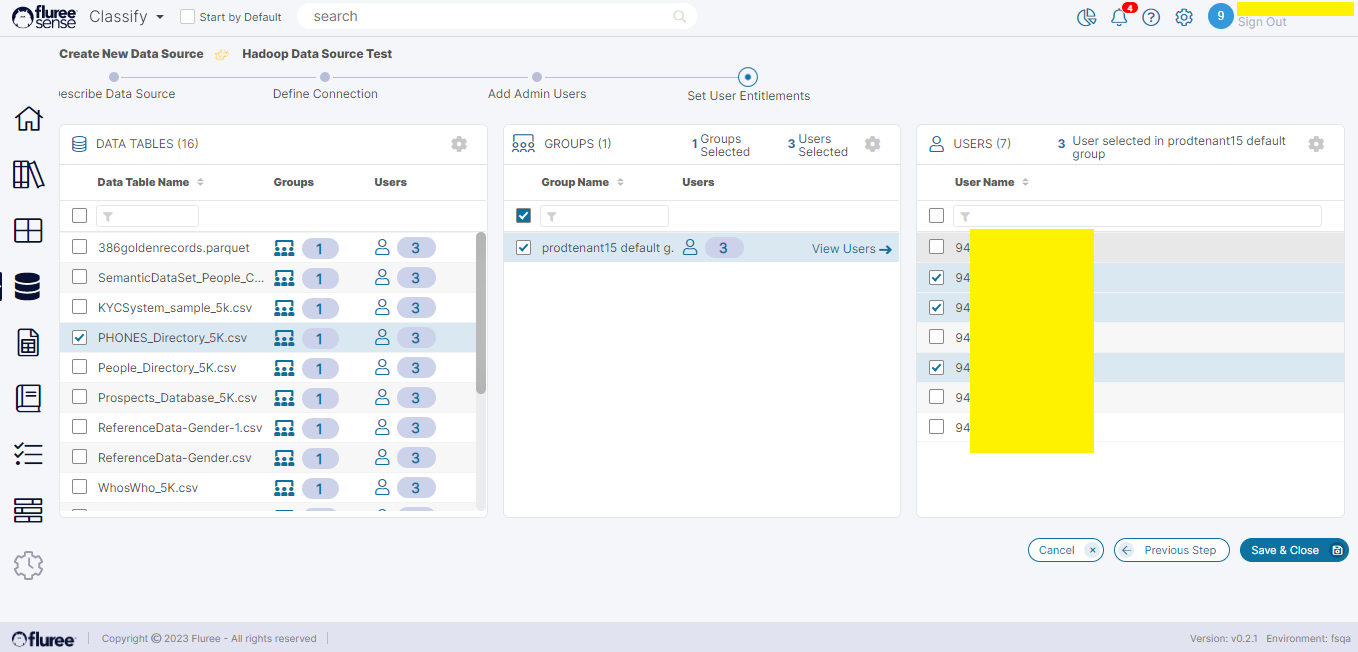 To recap: A user having the Data Source Admin role gets default entitlements to all the files. But there may be some Files or Tables which are relevant and supposed to be accessed by a certain set of users. For example, customer-related files are accessible by one set of users, Account related files are accessible by another set. In this case, the Data Source Admin user can grant other selected users access to specific content. This is done in the ‘Set User Entitlements’ step as follows: