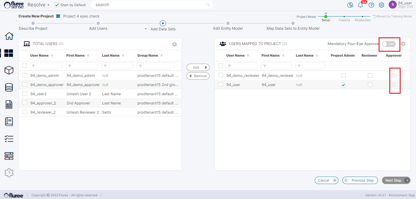 If the four-eyes are ON, then at least one reviewer and one approver are required. When it’s OFF, at least one reviewer is required for "Next Step" to be enabled.