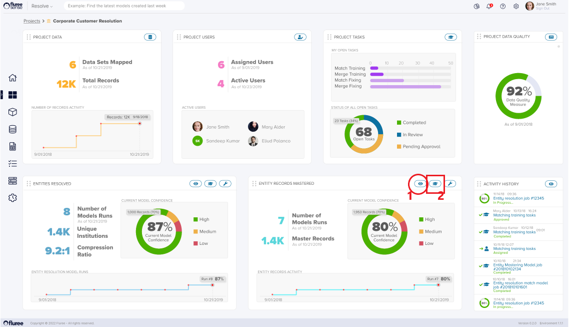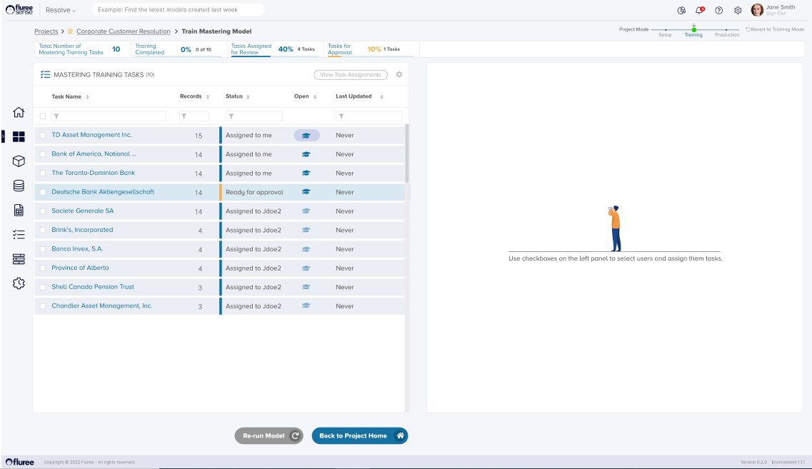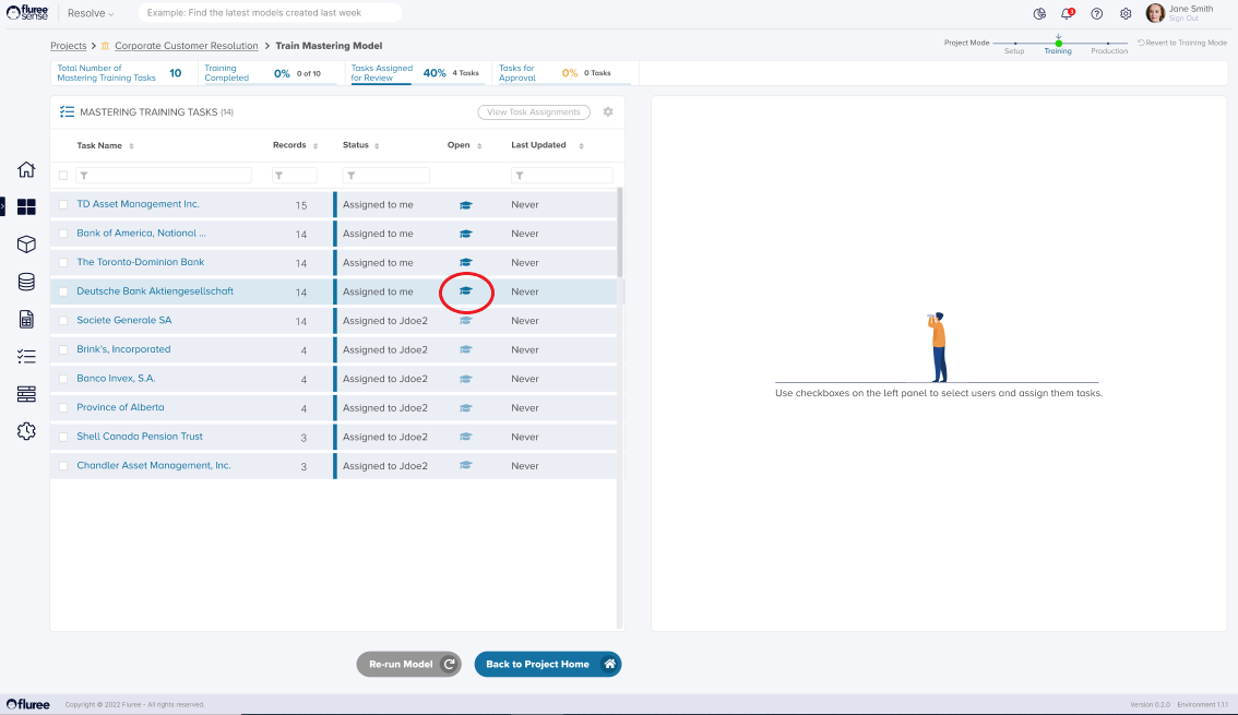 Click on the "Train Model" icon (marked 2) on the lower right-hand bottom of the page to enter the "Mastering Training Tasks" screen. Like "Entity Resolution" training, the System will display the set of generated Training Tasks in the left-hand panel: