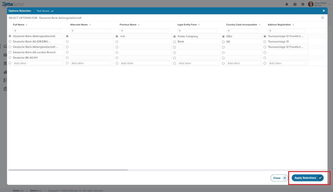 The System will display all unique possible values from all records within the cluster for each attribute. At the top, one can find the value selected by the model. The user can choose any other values or write another option in the free-form text field provided. The user must click the "Apply Selections" button after completing all the choice selections.