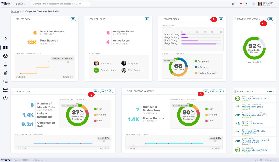 2. Entities Resolved: The results of the Entity Resolution (matching) model are displayed here. Here, one can view the confidence score stats, number of model runs, and summary stats on how much compression took place. Compression represents the ratio of original records to unique entities. For example, 500 unique entities found from a set of 1,000 records. In that case, the Compression Ratio is 2:1. From here, the Project’s users (Admin, Reviewer, Approver) can directly access the “Match Training” tasks by clicking the “Train Model” icon or the “Match Fixing” tasks by clicking “Fix Issues.” Besides the count of tasks, one can see how many have the “Completed,” “In Review,” or “Pending Approval” status. This gives you an overall perspective of how much work is still required to move the project closer to completion.
